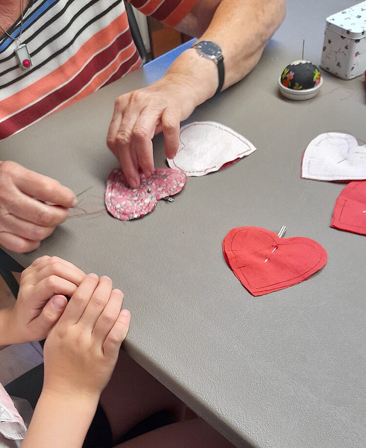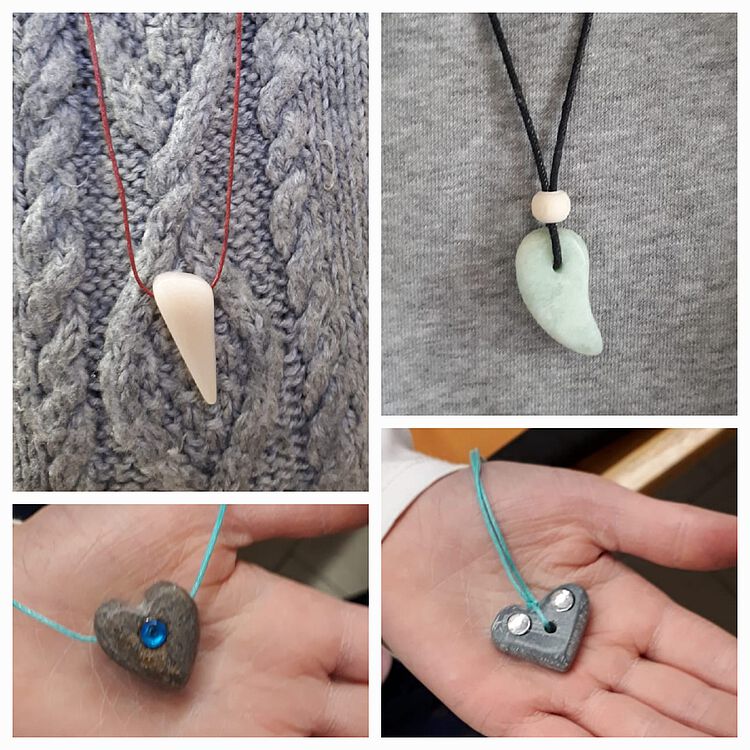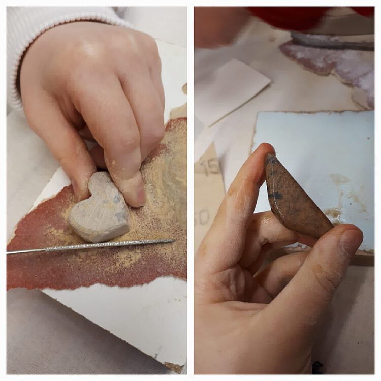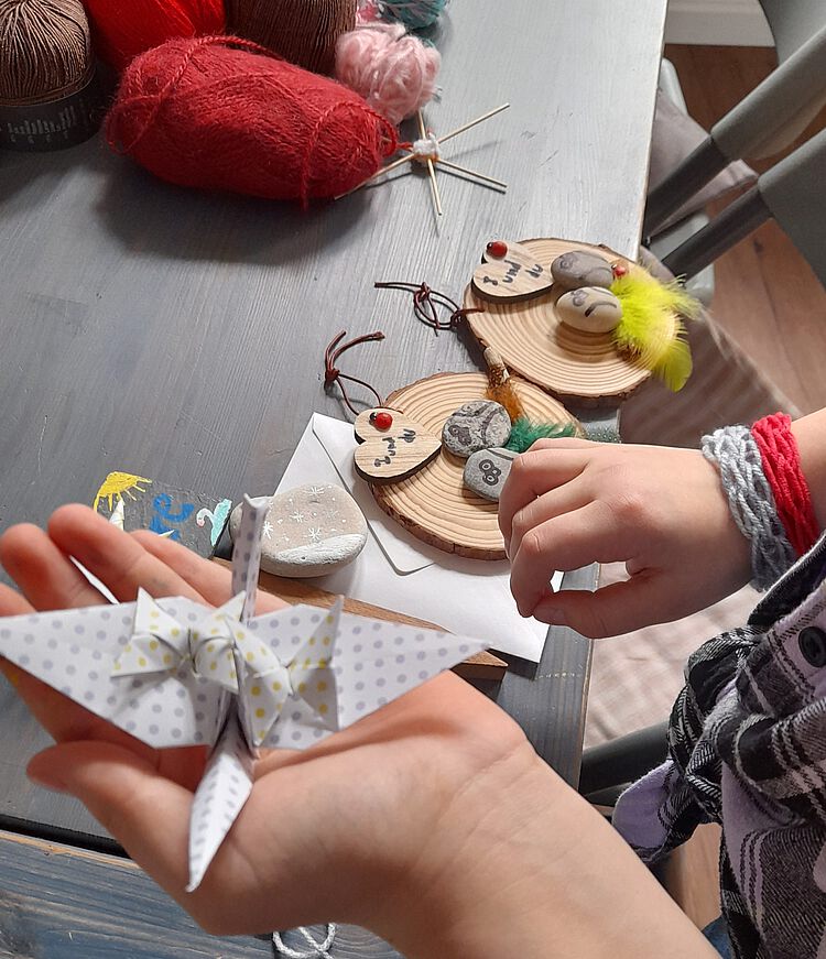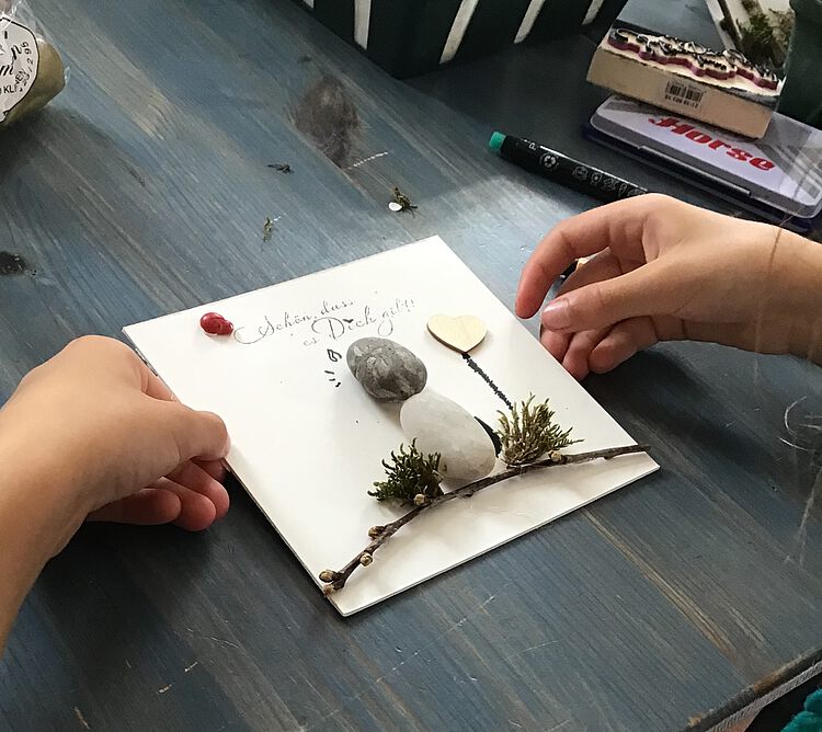 Begeistert und stolz nehmen sie die kleinen Dinge aus Speckstein, Kieselsteinen, „Edelsteinen“, Wolle, Farbe, Pappe, Papier und Naturmaterialien mit nach Hause.