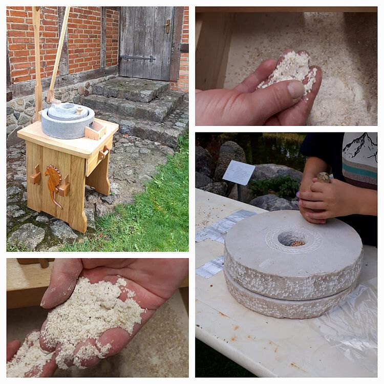 Außerdem erfahren sie Wissenswertes über die Anfänge des Getreidemahlens und sie dürfen auch selbst den Mahlstein drehen.